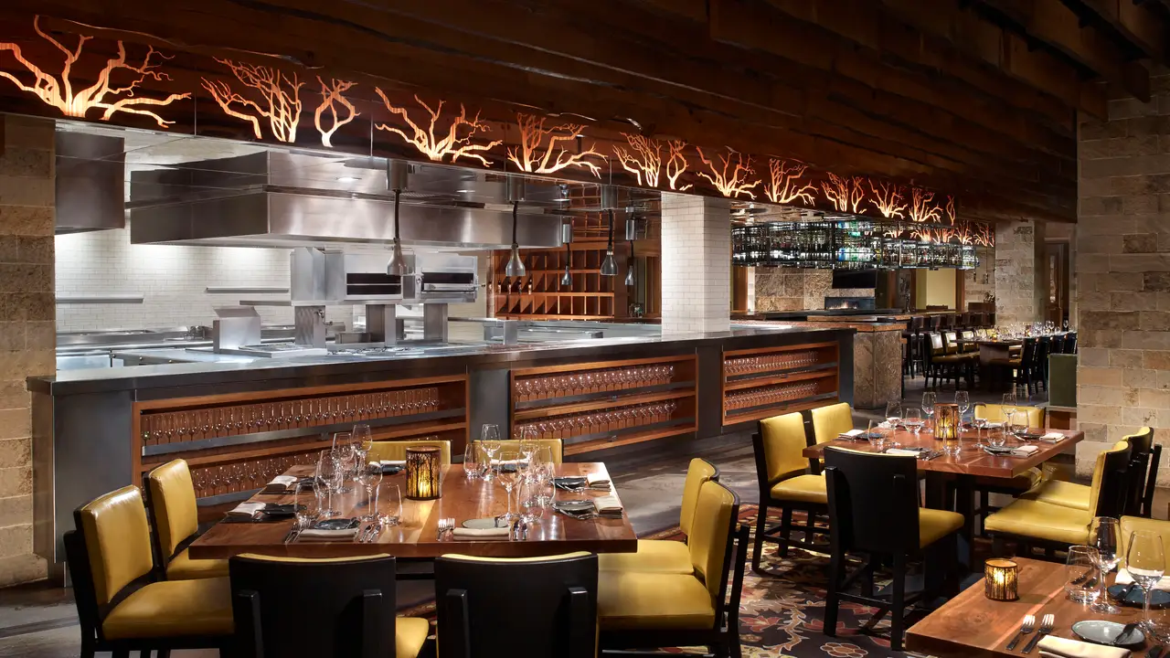 La pieza central es una columna de piedra de tres pisos que parece un tronco de árbol. Está rodeada de varias zonas para sentarse en diferentes niveles, con muchas chimeneas y acogedores sofás en lo que se llama acertadamente la Sala de Estar, un lugar para una velada perfecta de juegos de mesa y cena informal.